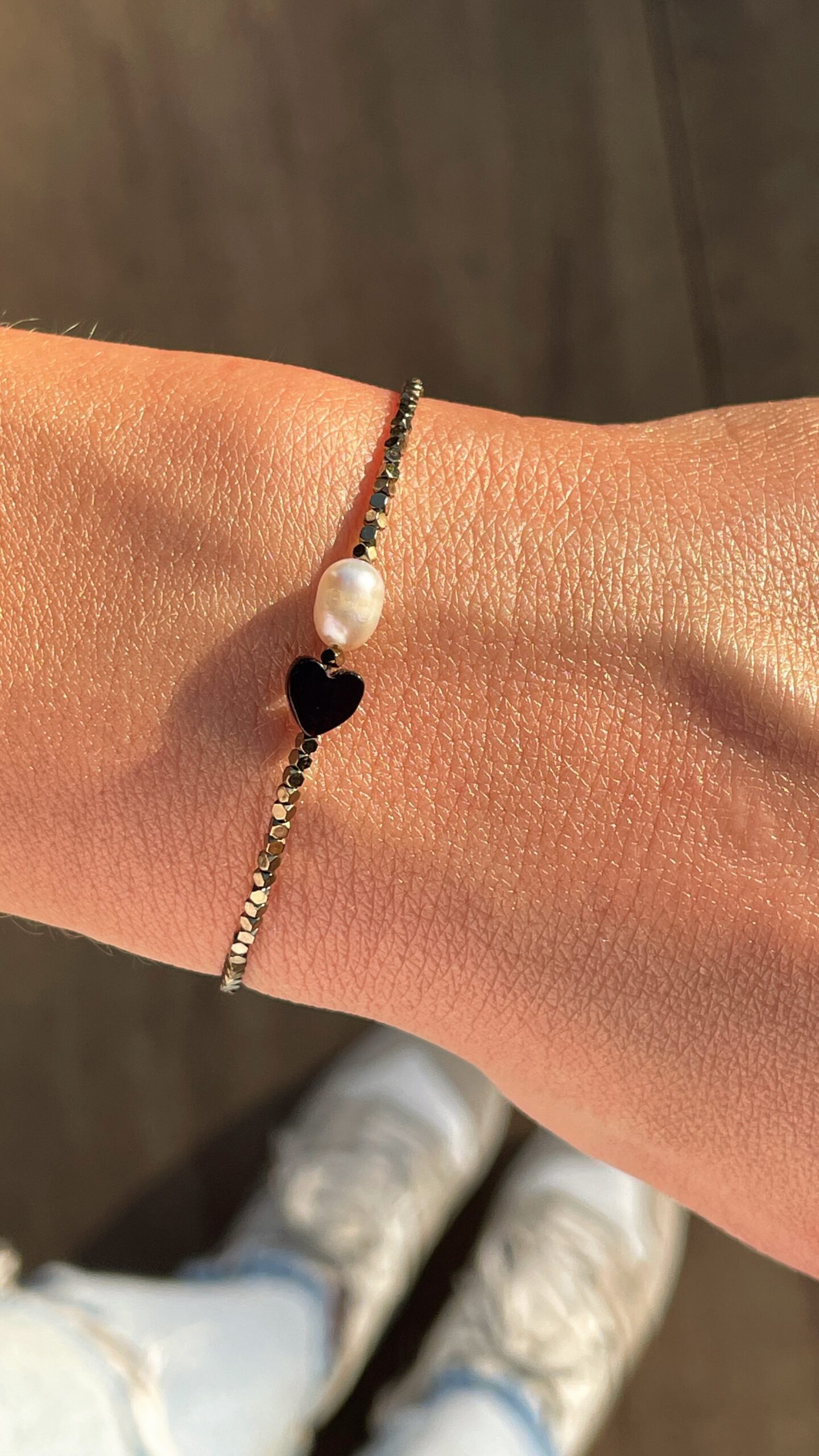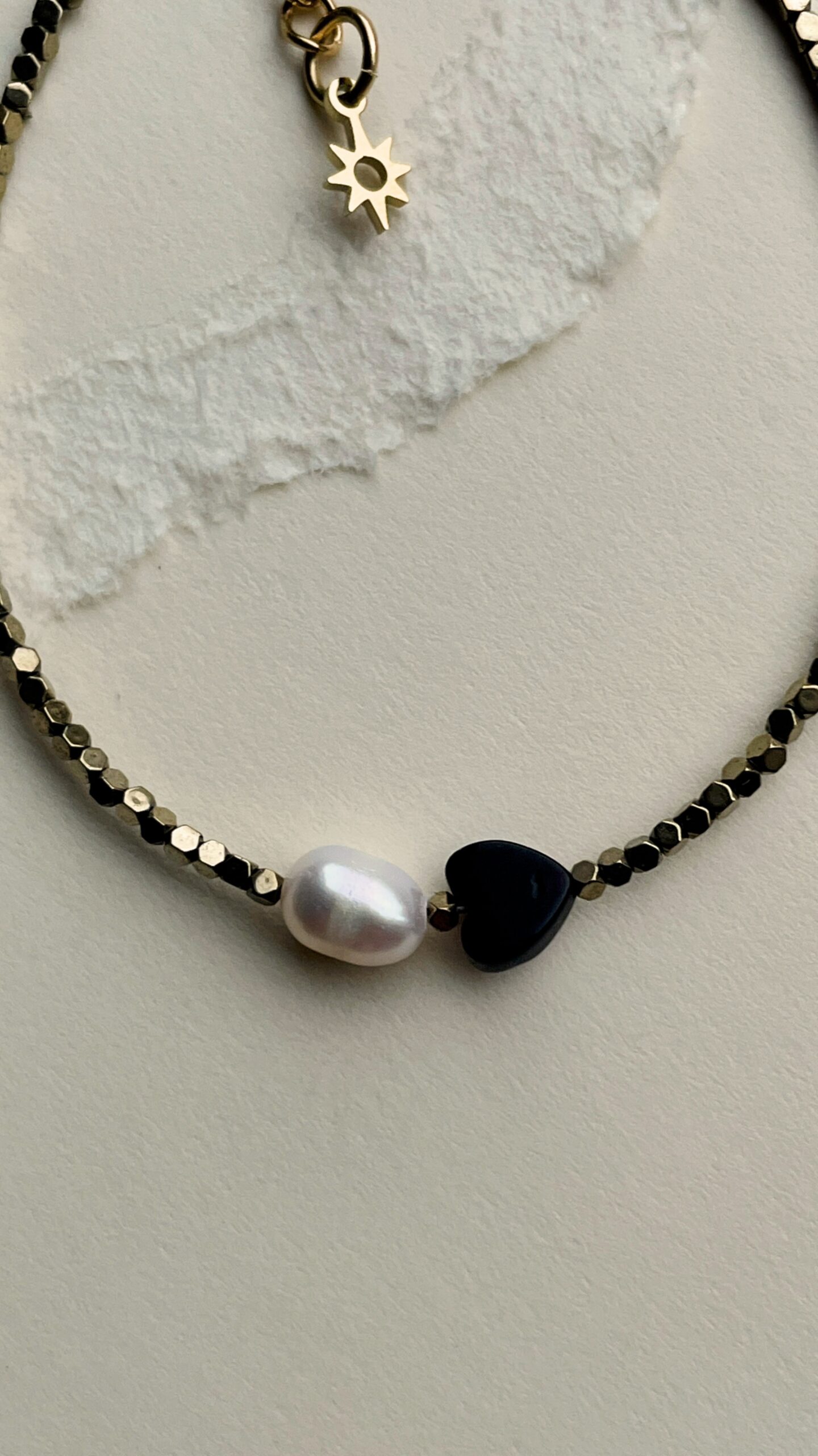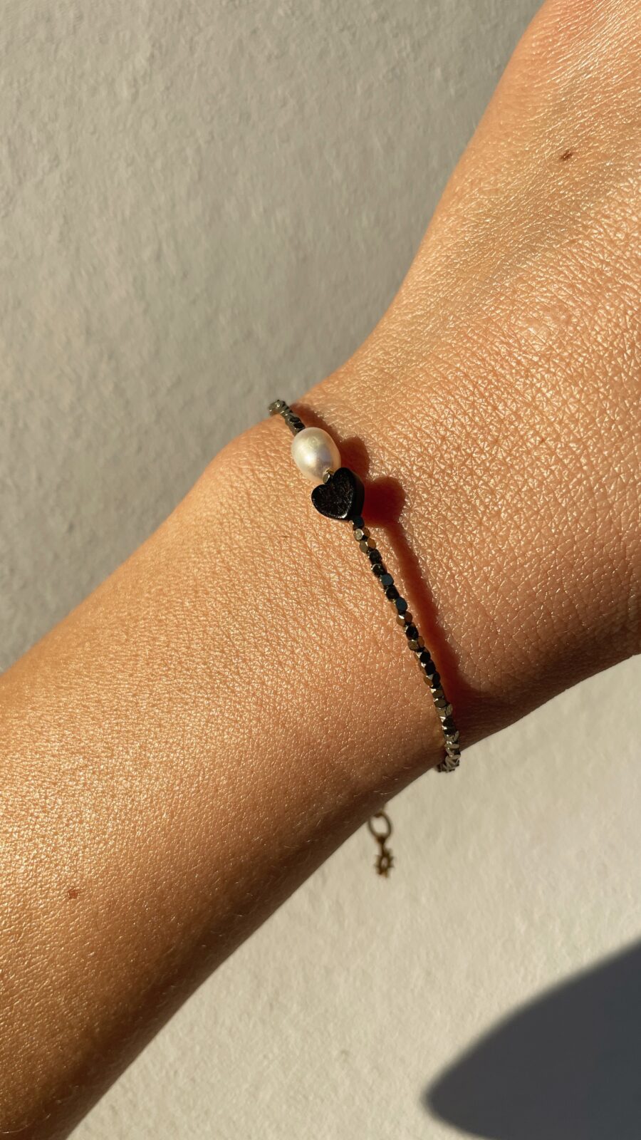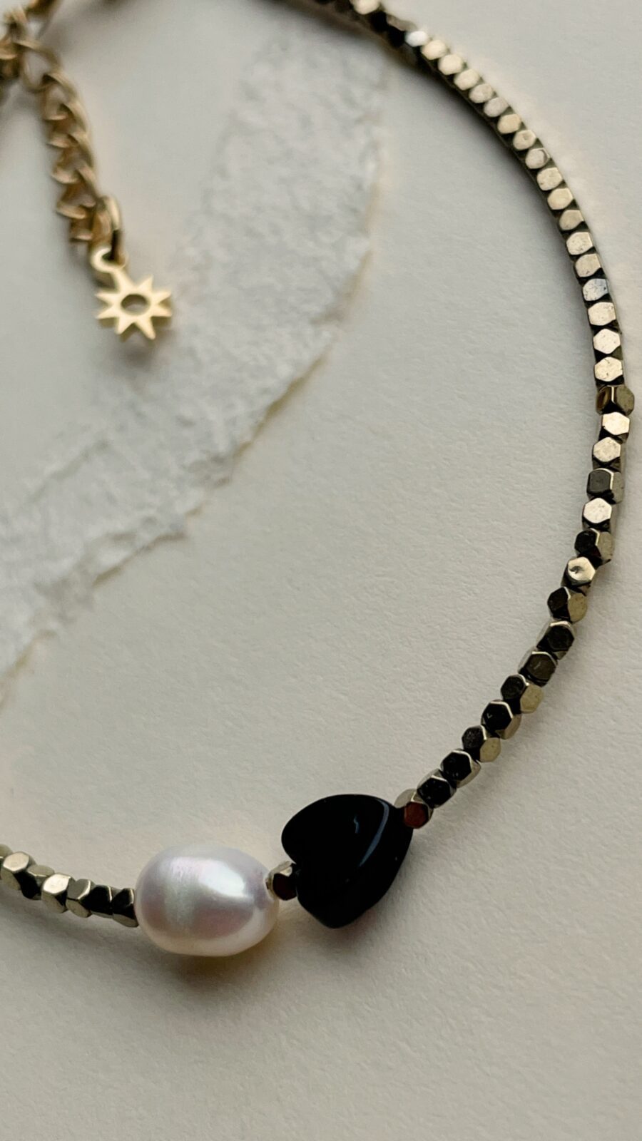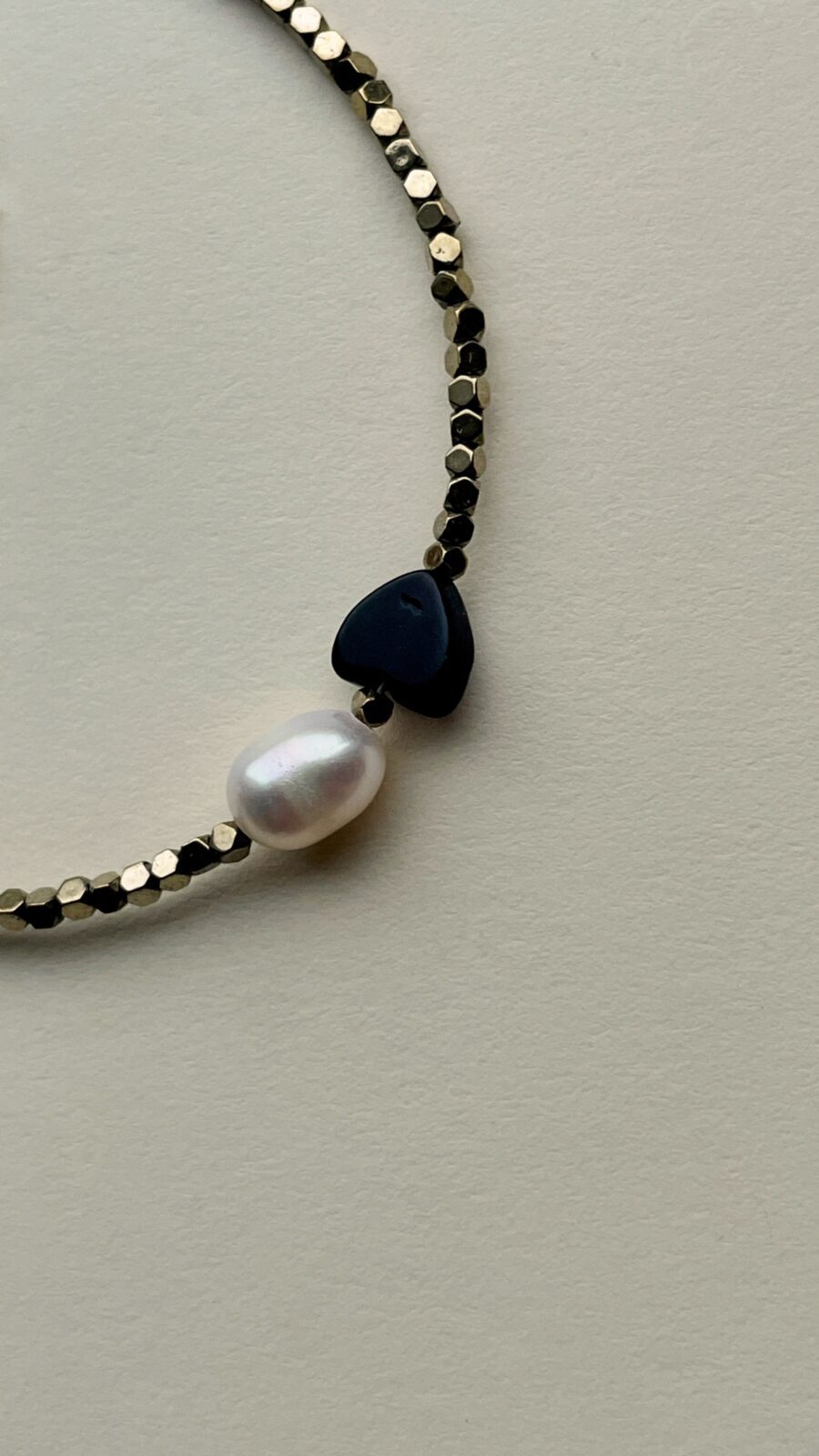 Bransoletka ta łączy w sobie naturalne piękno perły, onyksu w kształcie serca oraz połyskującego hematytu, tworząc harmonijną kompozycję zarówno estetyczną, jak i energetyczną.