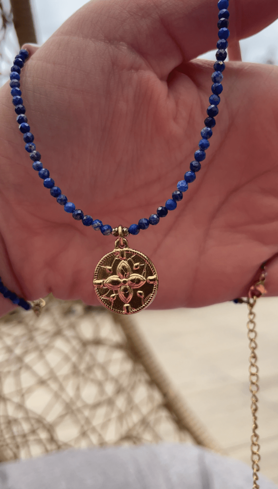 Ten naszyjnik to połączenie kamieni naturalnych lapis lazuli z rodonitem, z dodatkiem drobnych kamyczków hematytu, z przepiękną przywieszką ze stali szlachetnej w kolorze złotym. Do kompletu stworzyłam bransoletkę z tymi samymi kamieniami.