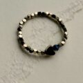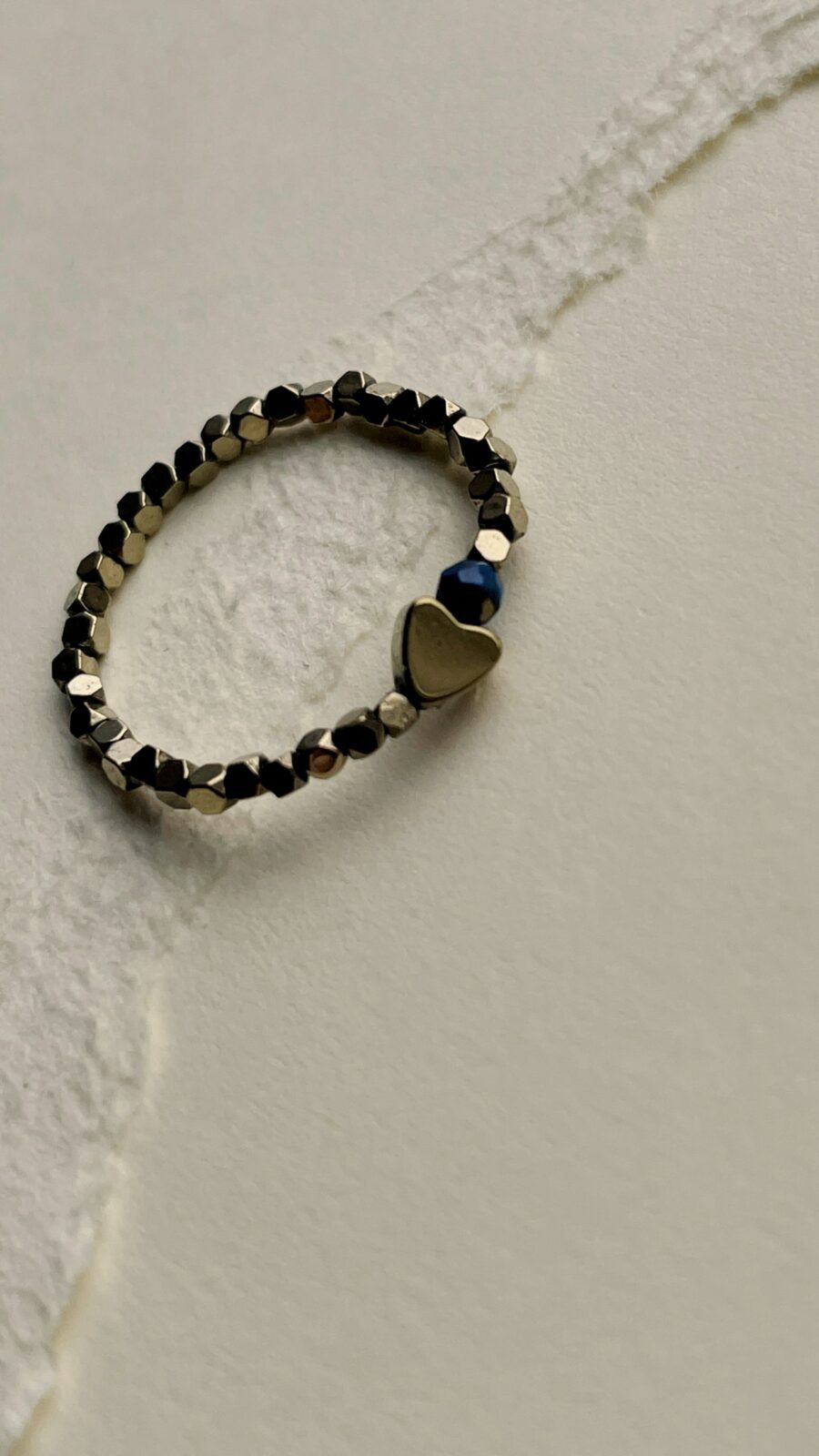 Delikatny pierścionek wykonany z hematytu w kolorze złotym, z niewielkim serduszkiem oraz kamykiem lapis lazuli.