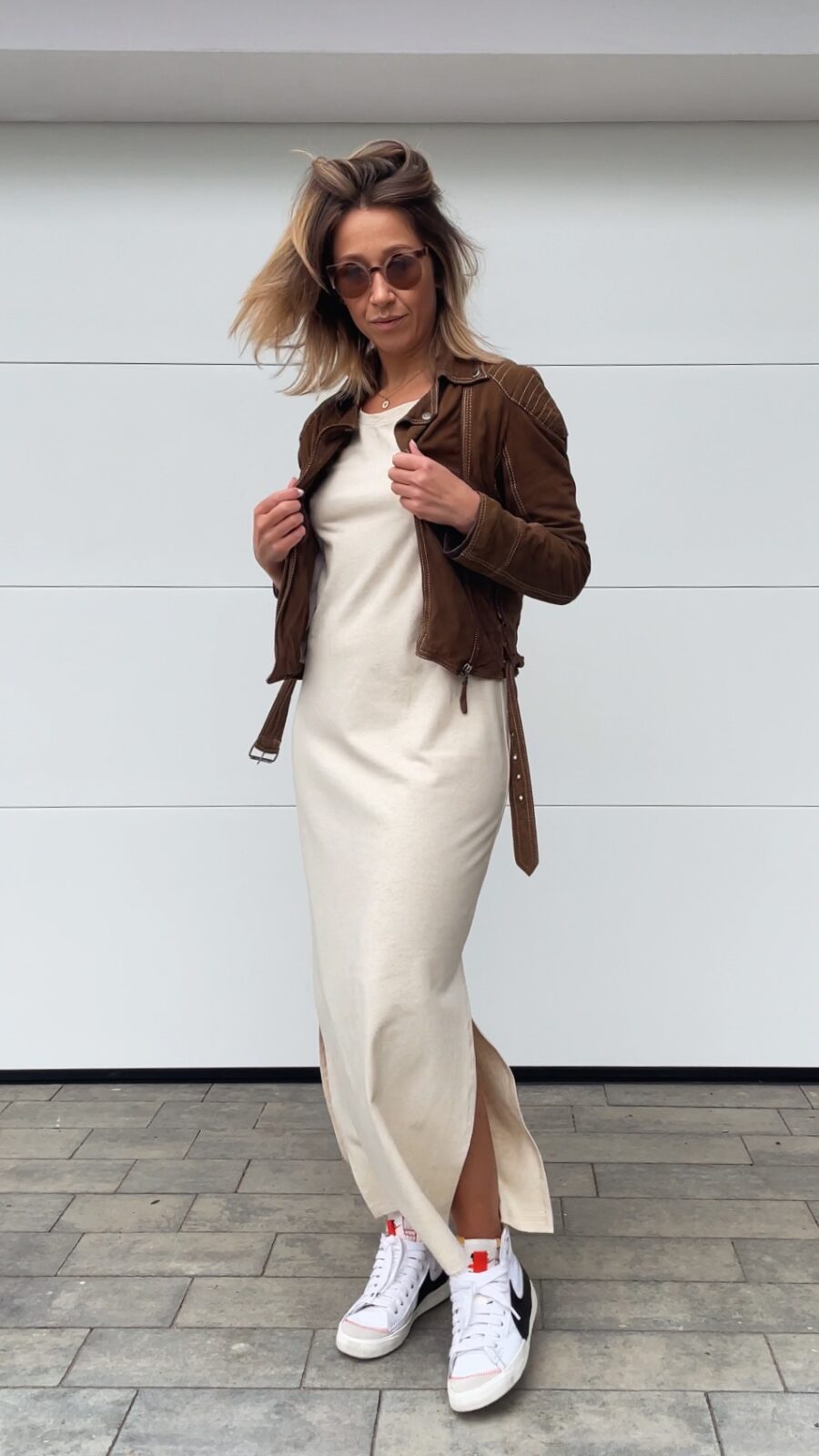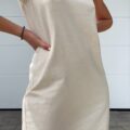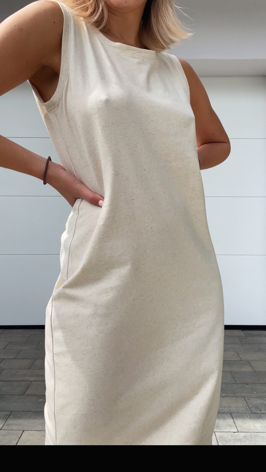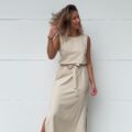 Sukienka MALTA oatmeal, wykonana jest z mięsistej dzianiny z lnem. Ma wyraźną surową strukturę. Sukienka jest delikatnie taliowana, ma rozcięcia po obu stronach. Jest bardzo kobieca, ale jednocześnie sportowa. Pięknie wygląda w połączeniu zarówno z obuwiem sportowym, jak i z sandałkami czy klapkami. Do sukienki dołączony jest pasek z tej samej dzianiny. Możemy więc nosić ją luźno bez paska lub z paskiem, podkreślając bardziej talię.